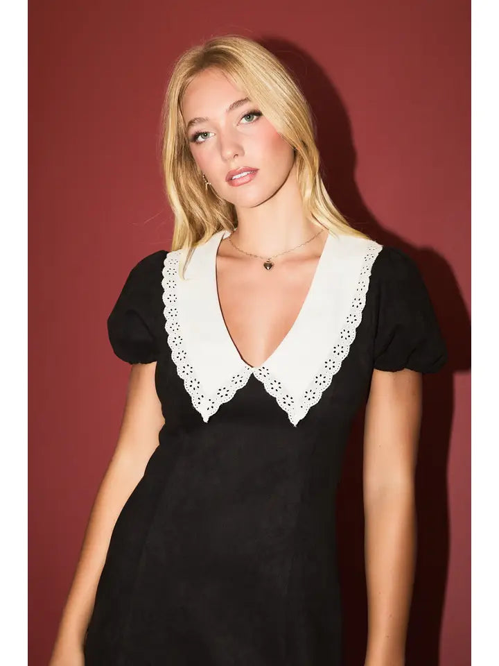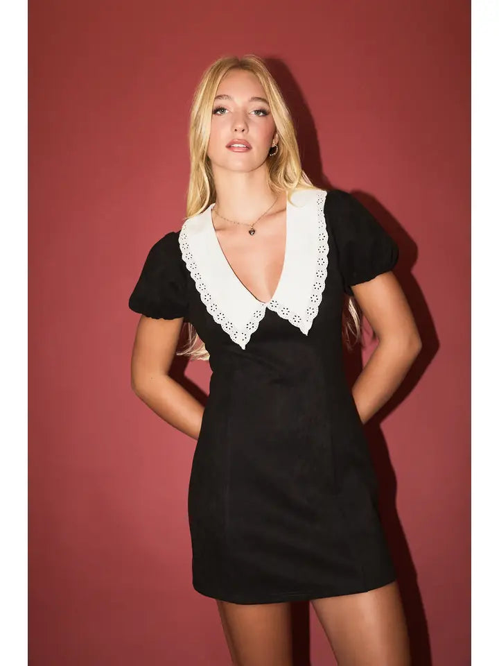 This suede mini dress blends vintage inspired puff sleeves with a trimmed collar for a touch of romantic charm. The soft texture and structured silhouette make it a standout piece. Perfect for turning heads day or night.