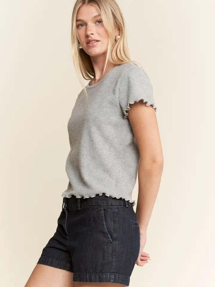 Soft, stretchy ribbed tee with sweet ruffle trim—cute, comfy, and easy to wear. Fits true to size. Not a Fitted Tee 82% Polyester, 15% Rayon, 3% Spandex